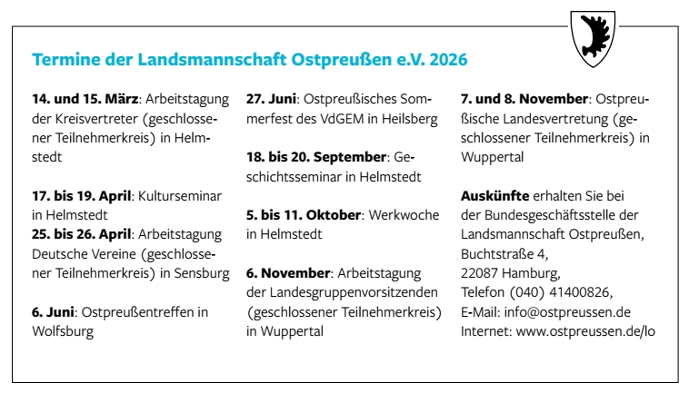 Auskünfte erhalten Sie bei der Bundesgeschäftsstelle der Landsmannschaft Ostpreußen, Buchstraße 4, 22087 Hamburg, Tel: (040) 41400826